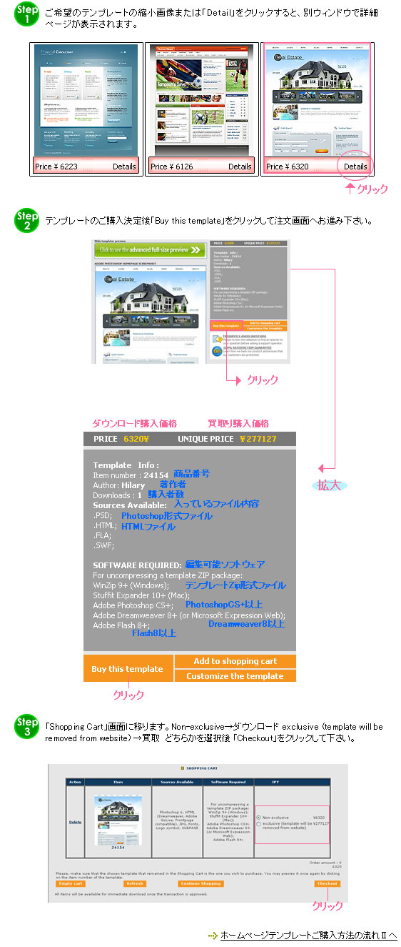 >> ご購入方法 ホームページテンプレートご購入方法の流れT